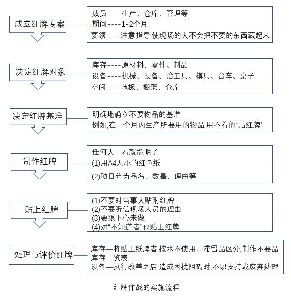 貼附的紅牌移往紅牌集中處后,應予以記錄。將貼上紙牌者,按永不使用、滯留品區(qū)分,制作不要品庫存一覽表,對于設備-執(zhí)行改善之后,造成困擾阻礙時,不以支持或廢棄處理。紅牌作戰(zhàn)看板流程具體細節(jié)內(nèi)容如上圖所示。